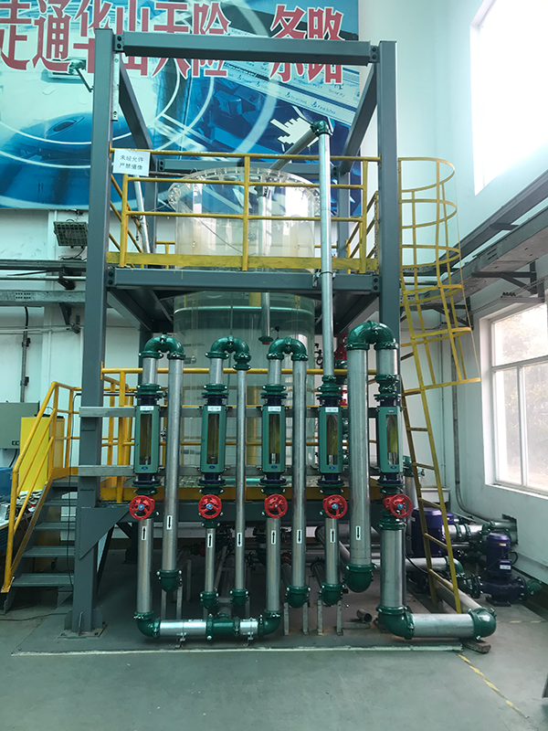 以水-空氣為實驗介質,在標準型鼓泡塔中,用電導率,溶氧電極儀器分別在不同的位置測量,整體,局部氣含率, 液速液相混合時間,氣液傳質系數。